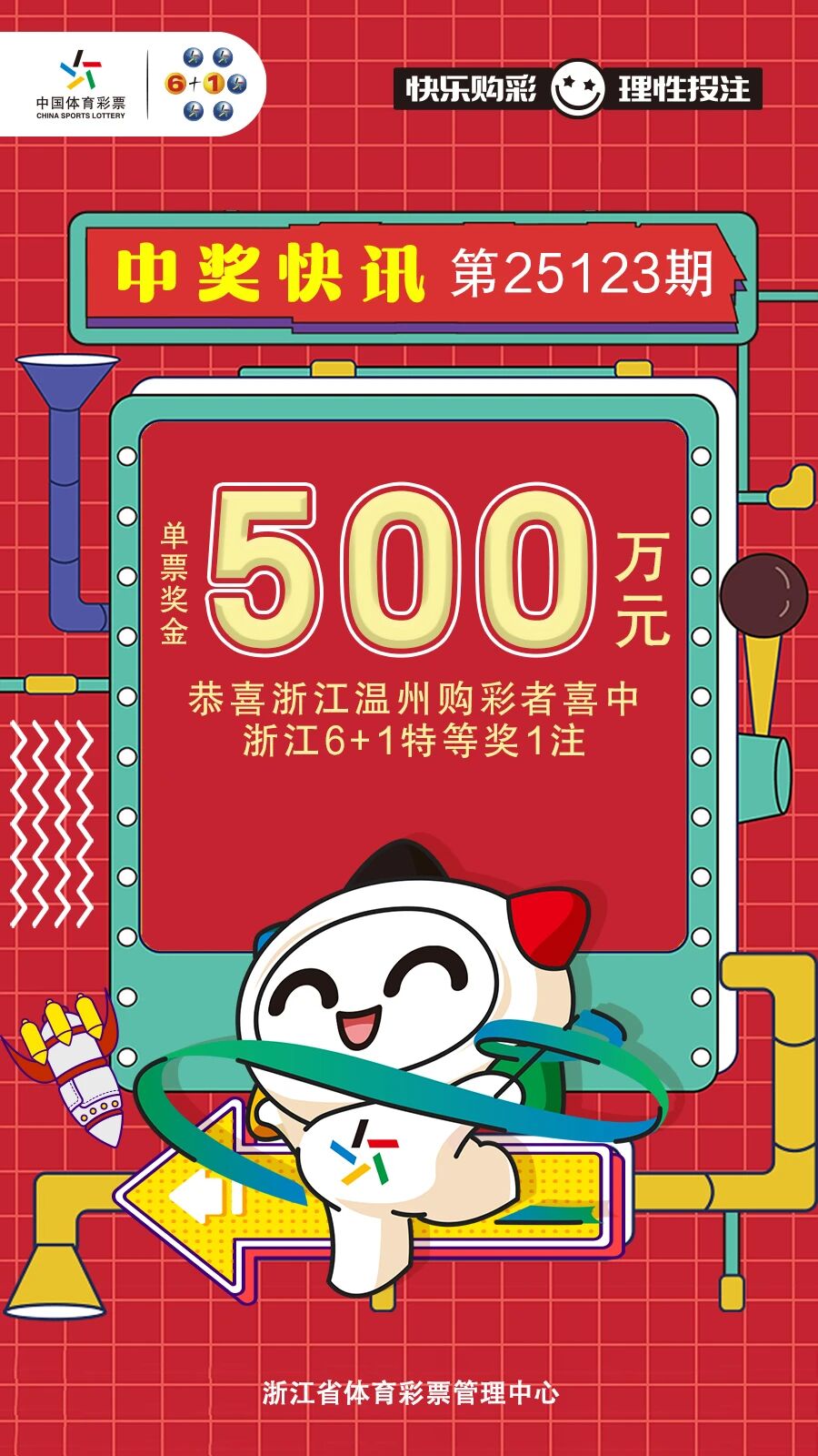 10月26日,体彩浙江6+1第25123期开奖,本期温州中出1注特等奖,单票奖金500万元。