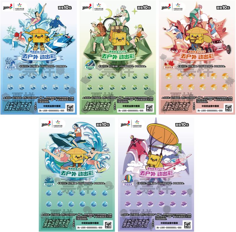 “去户外 动出彩”即开票面值10元,共有5个票面场景,以中国户外运动产业大会吉祥物“司南侠”为主形象,将传统文化与户外精神巧妙融合——“司南侠”在冰上舞动、在山野徒步、在林间骑行、在水上划桨、在云间穿梭,带领购彩者体验户外运动乐趣!