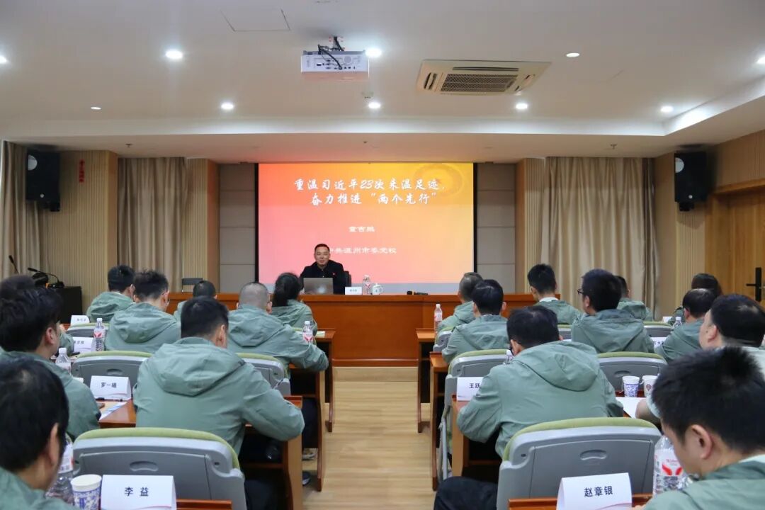 浙江省委党校马克思主义理论研究会常务理事童吉鹏在《重温习近平23次来温足迹 奋力推进“两个先行”》课程中,播放宣传纪录片,鼓励筑牢党建引领根基、深悟总书记来温精神内涵,牢记总书记对温州的殷殷嘱托。