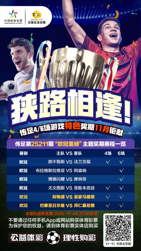 传足4/6场游戏特色奖期第25211期已经于2025年11月2日20:00开售,将于2025年11月4日22:00停售,并于11月5日开奖,其中那不勒斯VS法兰克福、尤文图斯VS里斯本竞技、利物浦VS皇家马德里和巴黎圣日尔曼VS拜仁慕尼黑为4场进球游戏竞猜赛事。