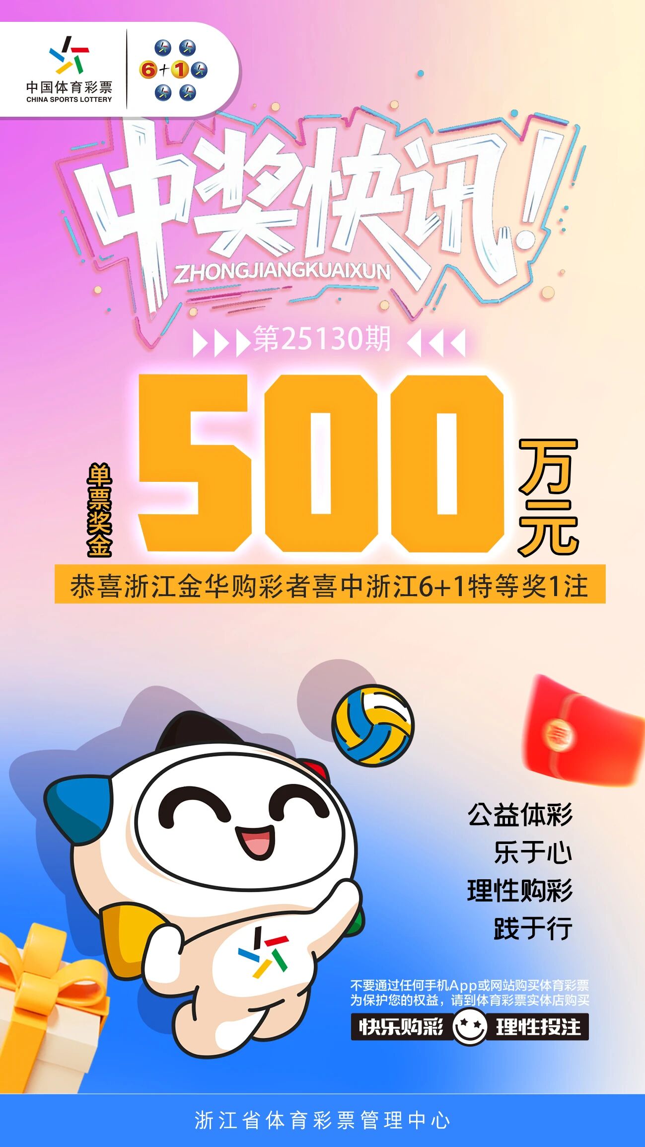 11月11日,体彩浙江6+1第25130期开奖,本期金华中出1注特等奖,单票奖金500万元。
