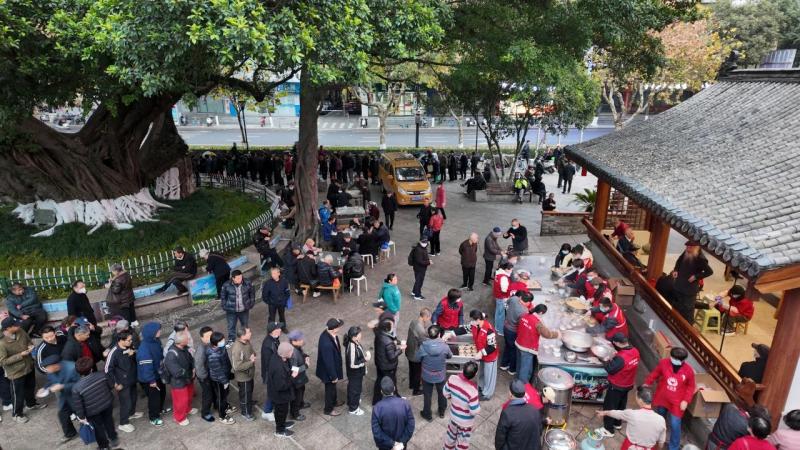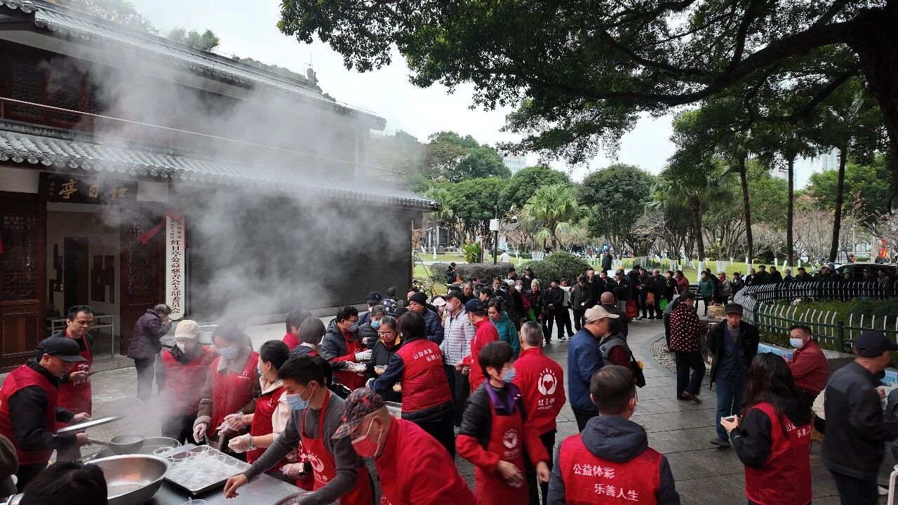 12月21日,冬至清晨。寒风裹挟着冬日的凛冽,却未能吹散华盖山下红日亭升腾的热气。温州市体育彩票管理中心的志愿者们早早来到这里,与红日亭的银龄义工们一同开展"冬至送暖意 体彩传真情"志愿活动。一碗碗象征团圆与温暖的冬至汤圆,在志愿者手中传递,为这座城市注入最朴素的节日祝福。