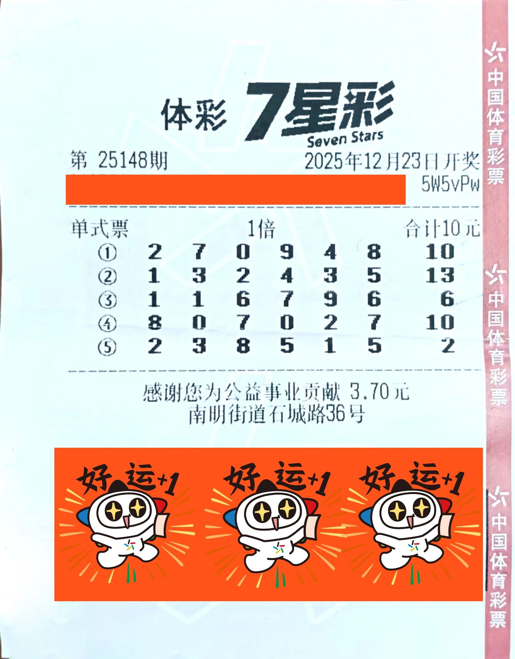 12月23日,体彩7星彩第25148期开奖,当期全国仅中出1注一等奖,单票奖金500万元,幸运花落我省绍兴市。