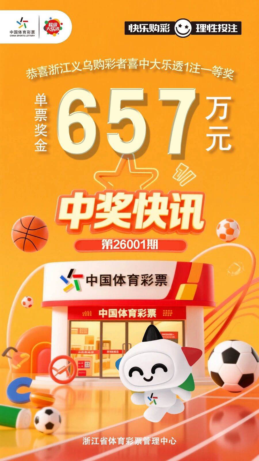 1月3日,体彩大乐透第26001期开奖,当期全国中出13注一等奖,单注奖金657万元,其中4注追加投注,追加奖金525万元。