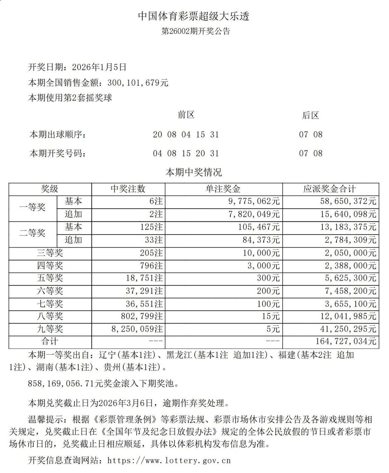 1月5日,超级大乐透第26002期开奖。前区开出号码04、08、15、20、31;后区开出号码07、08。