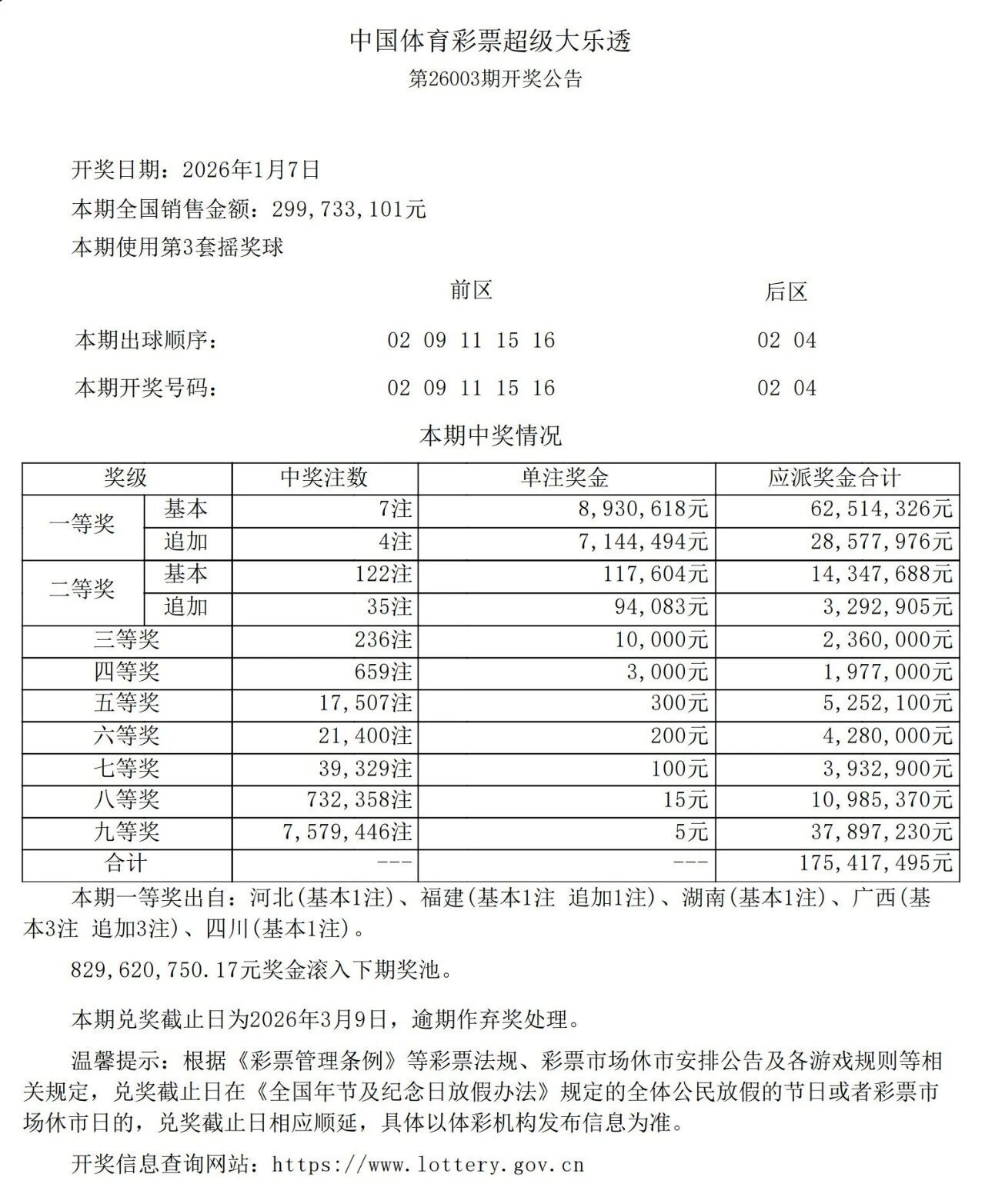 1月7日,超级大乐透第26003期开奖。前区开出号码02、09、11、15、16;后区开出号码02、04。