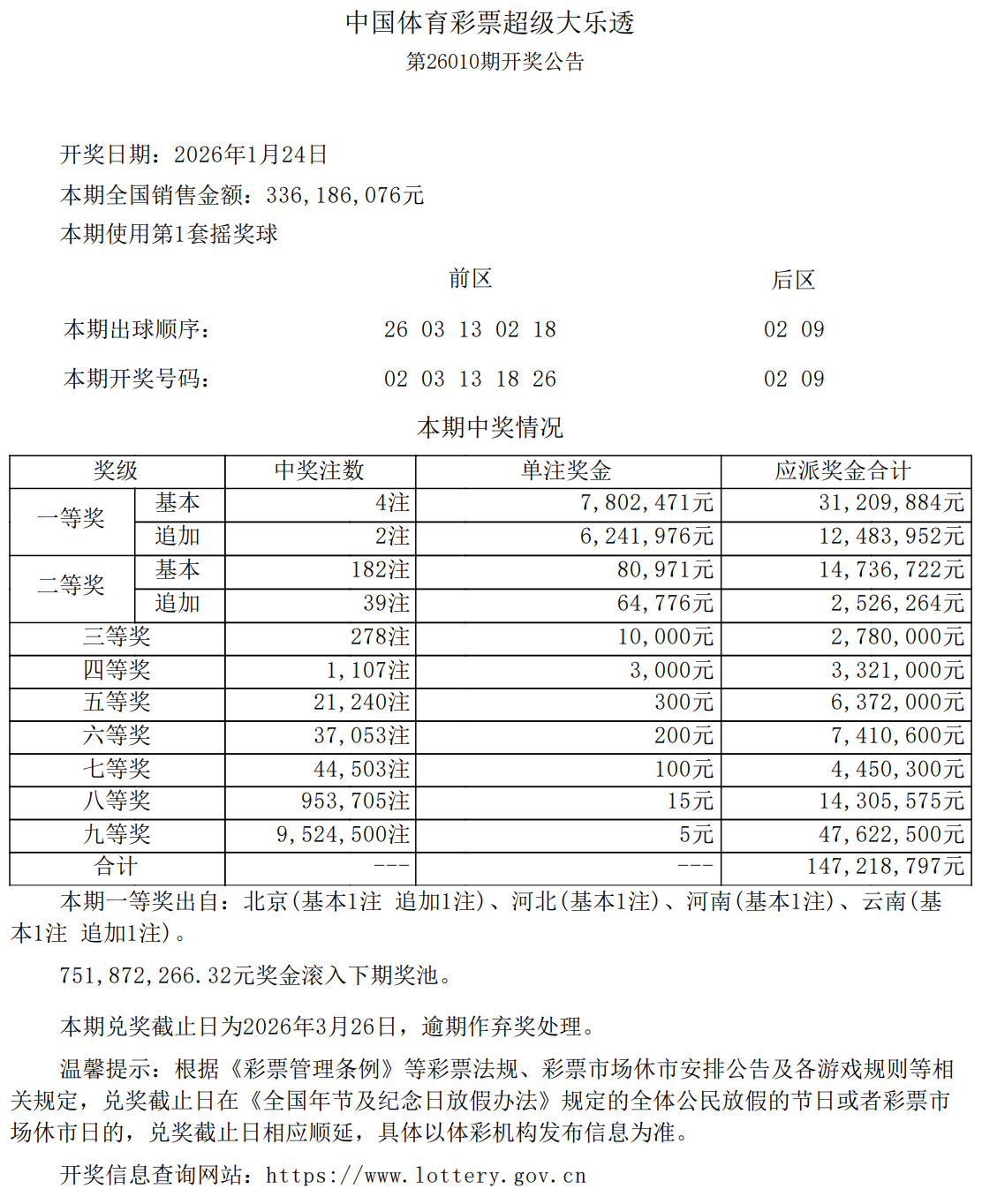 1月24日,超级大乐透第26010期开奖。前区开出号码02、03、13、18、26;后区开出号码02、09。