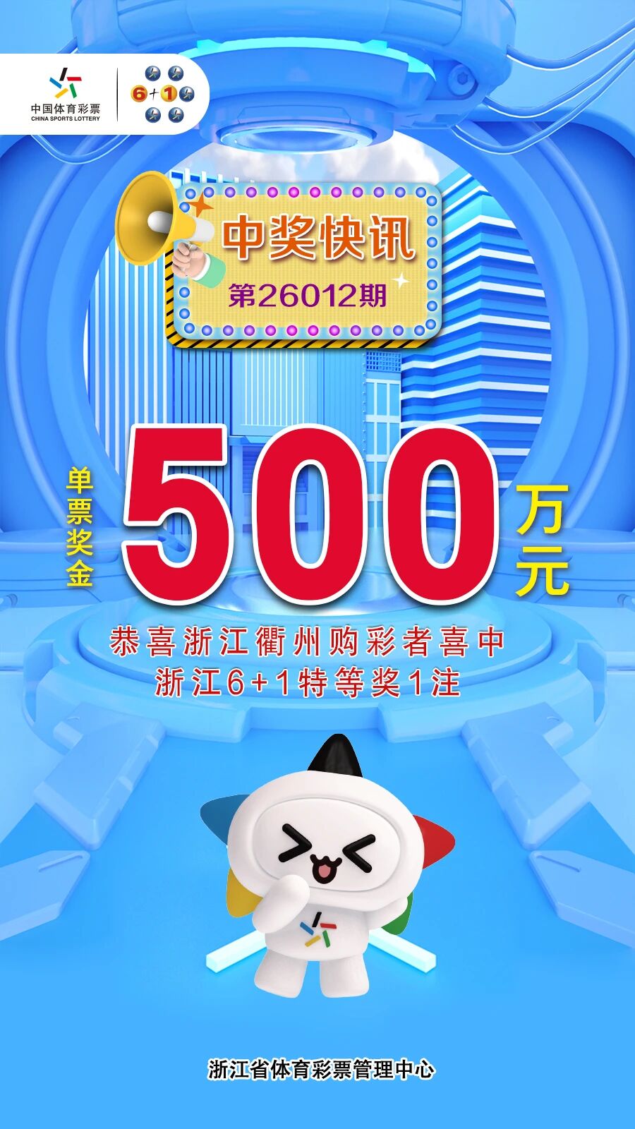 1月27日,体彩浙江6+1第26012期开奖,当期衢州中出1注特等奖,单票奖金500万元。