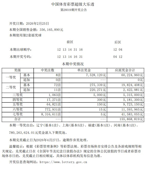 2月25日,超级大乐透第26019期开奖。前区开出号码12、13、14、16、31;后区开出号码04、12。