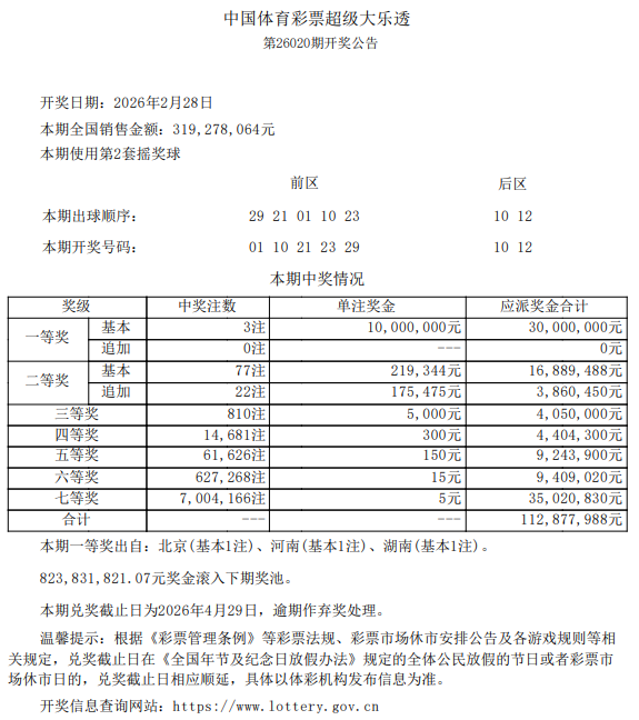 2月28日,超级大乐透第26020期开奖。前区开出号码01、10、21、23、29;后区开出号码10、12。