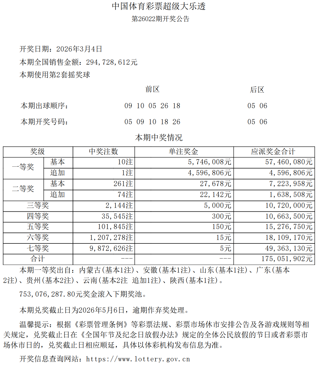 3月4日,超级大乐透第26022期开奖。前区开出号码05、09、10、18、26;后区开出号码05、06。