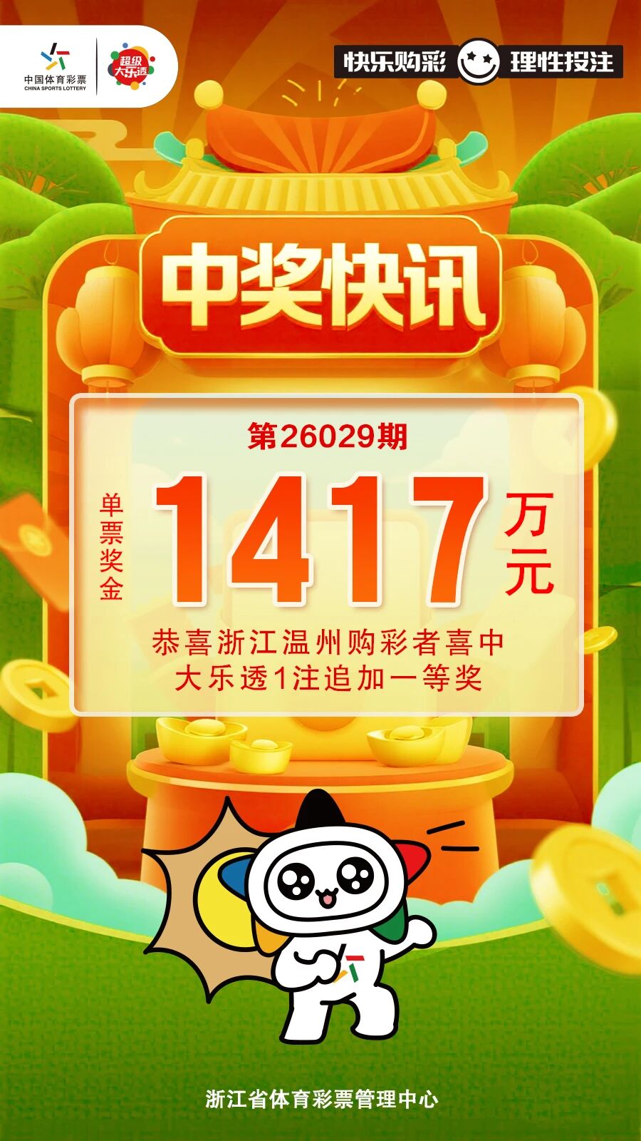 本期我省温州中出1注追加一等奖,单票奖金1417万元。