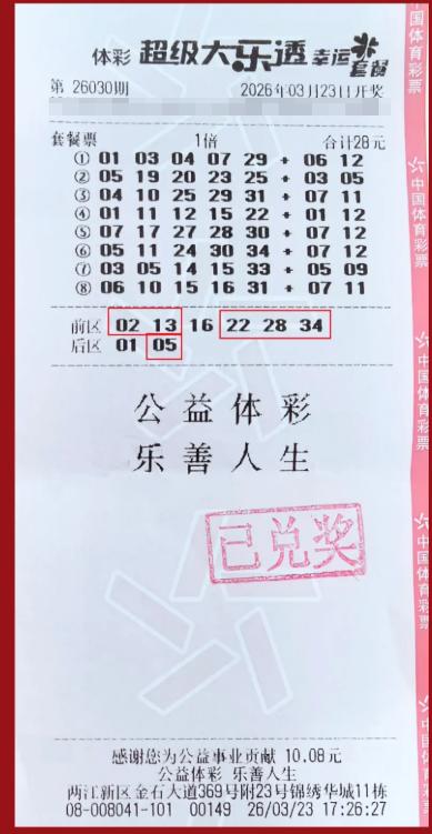 3月23日超级大乐透第26030期开奖,重庆两江新区购彩者赵先生,用一张28元套餐票,凭借票中“6+2”复式组合中得1注二等奖,同时中得5注四等奖,实现了大乐透套餐票“一票多奖”的双重幸运。