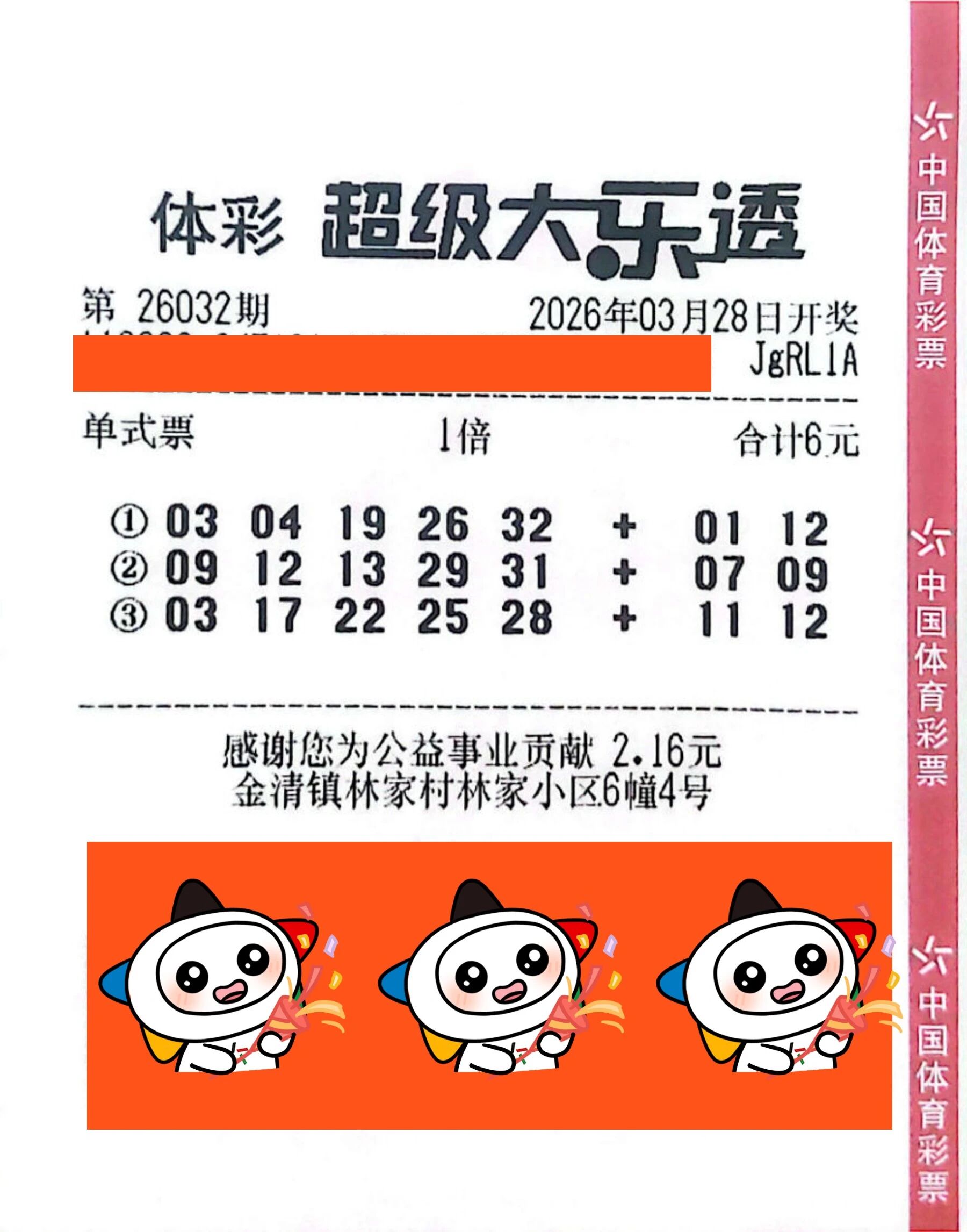 3月28日,体彩大乐透第26032期开奖,当期全国中出6注一等奖,单注奖金814万元。本期,我省台州购彩者凭借一张6元3注的单式票成功斩获一等奖,拿下 814万元单注大奖。