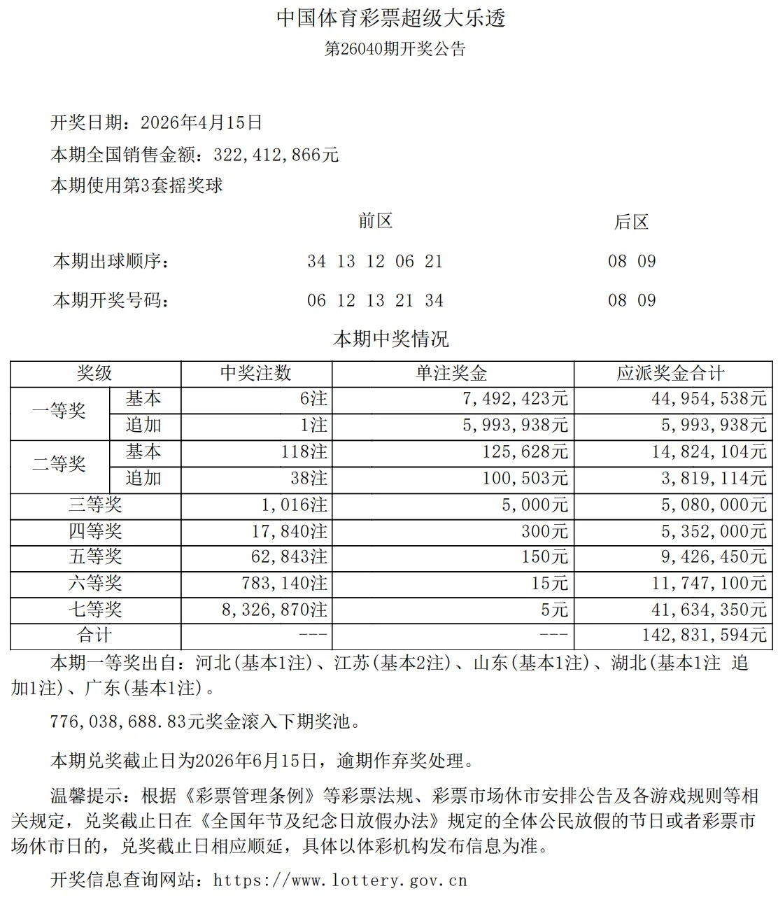4月15日,超级大乐透第26040期开奖。前区开出号码06、12、13、21、34;后区开出号码08、09。