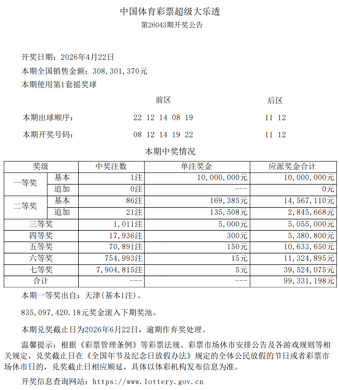 4月22日,超级大乐透第26043期开奖。前区开出号码08、12、14、19、22;后区开出号码11、12。