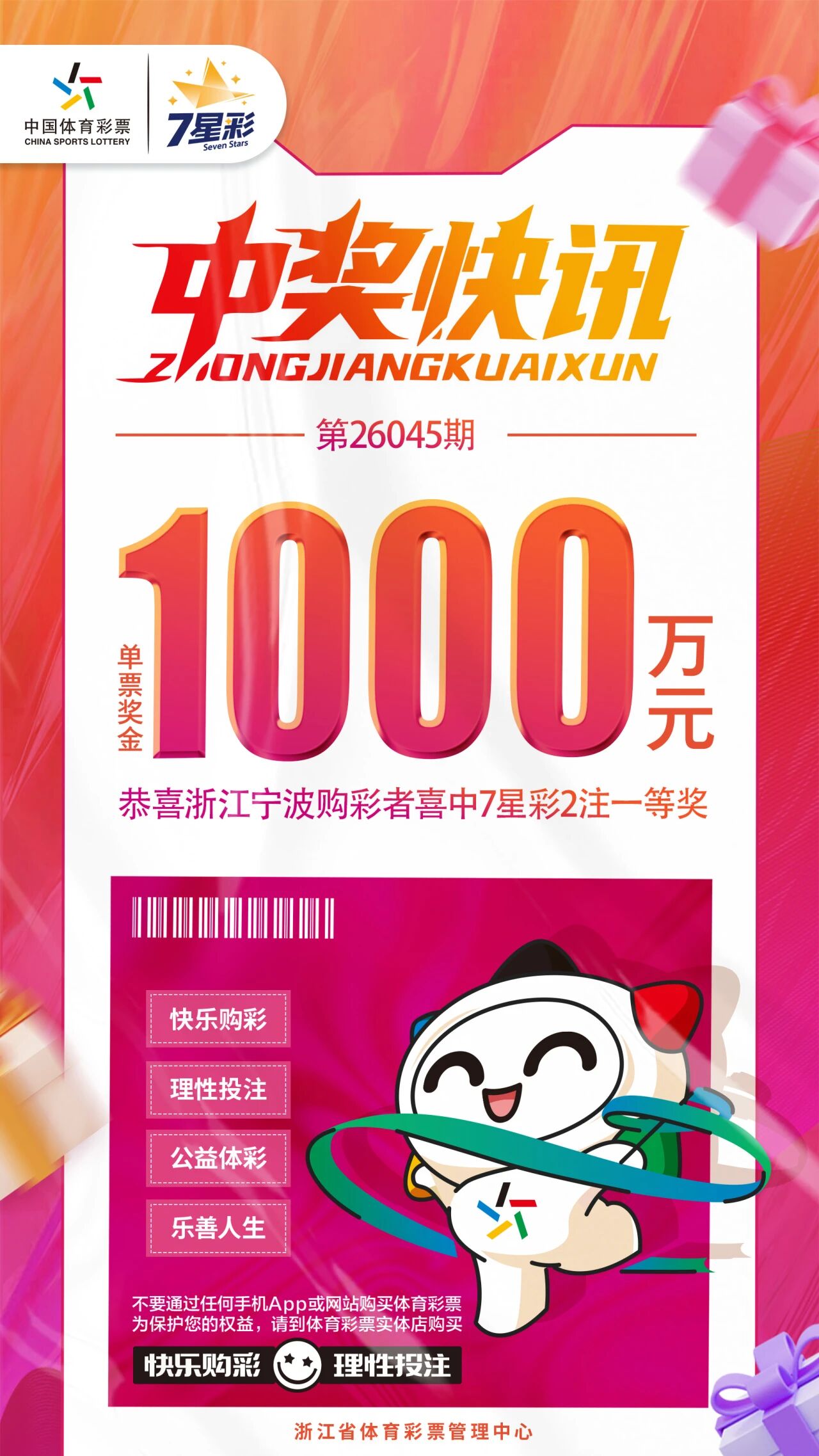 4月24日,体彩7星彩第26045期开奖,当期全国中出3注一等奖,单注奖金500万元。本期我省宁波中出2注一等奖,单票奖金1000万元。